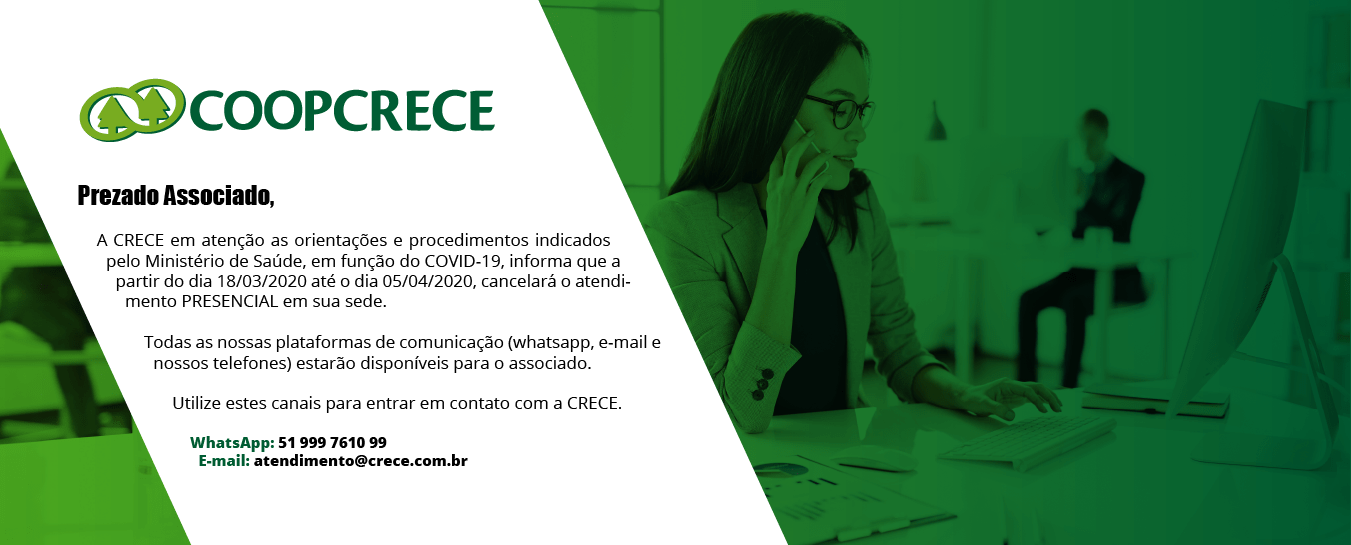 A CRECE em atenção as orientações e procedimentos indicados pelo Ministério de Saúde, em função do COVID-19, informa que a partir do dia 18/03/2020 até o dia 05/04/2020, cancelará o atendimento PRESENCIAL em sua sede.